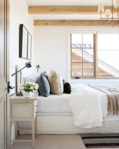 The beauty of modern farmhouse is that it has both masculine and feminine elements to its design. Take this bathroom by design company LeClair Décor. The black hardware, clean lines and industrial light fixtures give an almost industrial feel to the space, while it’s softened by the use of the vintage runner, plants and lots of natural light.